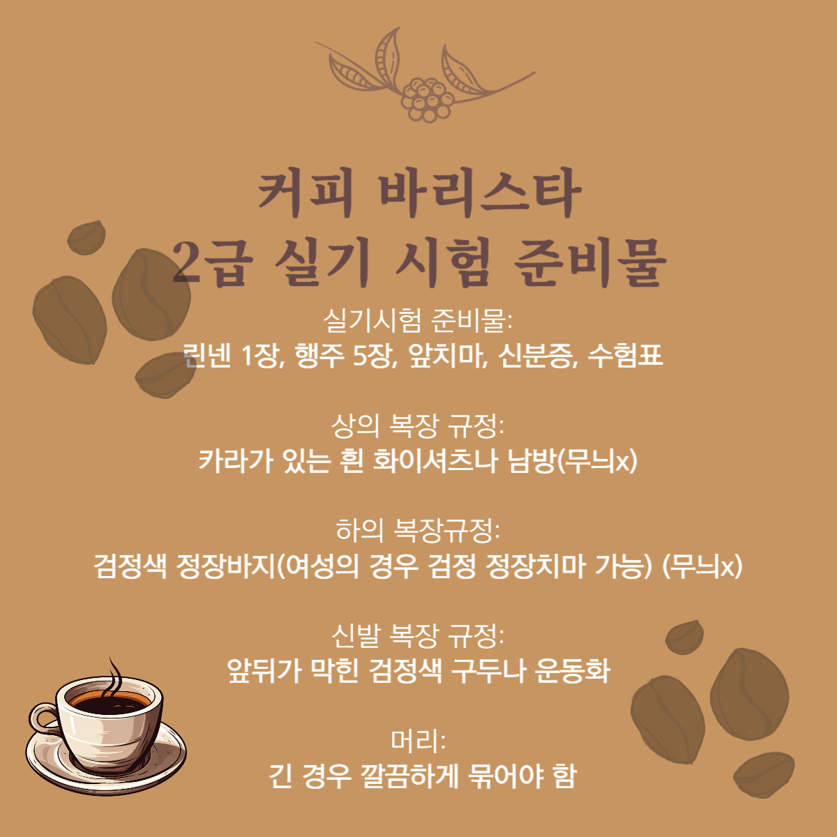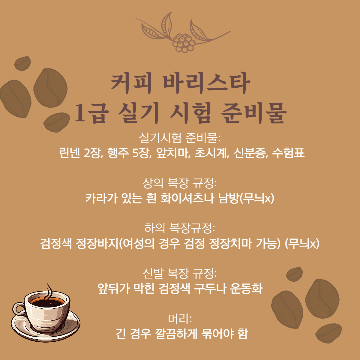 👉 1급 실기시험 준비물: 리넨 2장, 행주 5장, 앞치마, 초시계, 신분증, 수험표