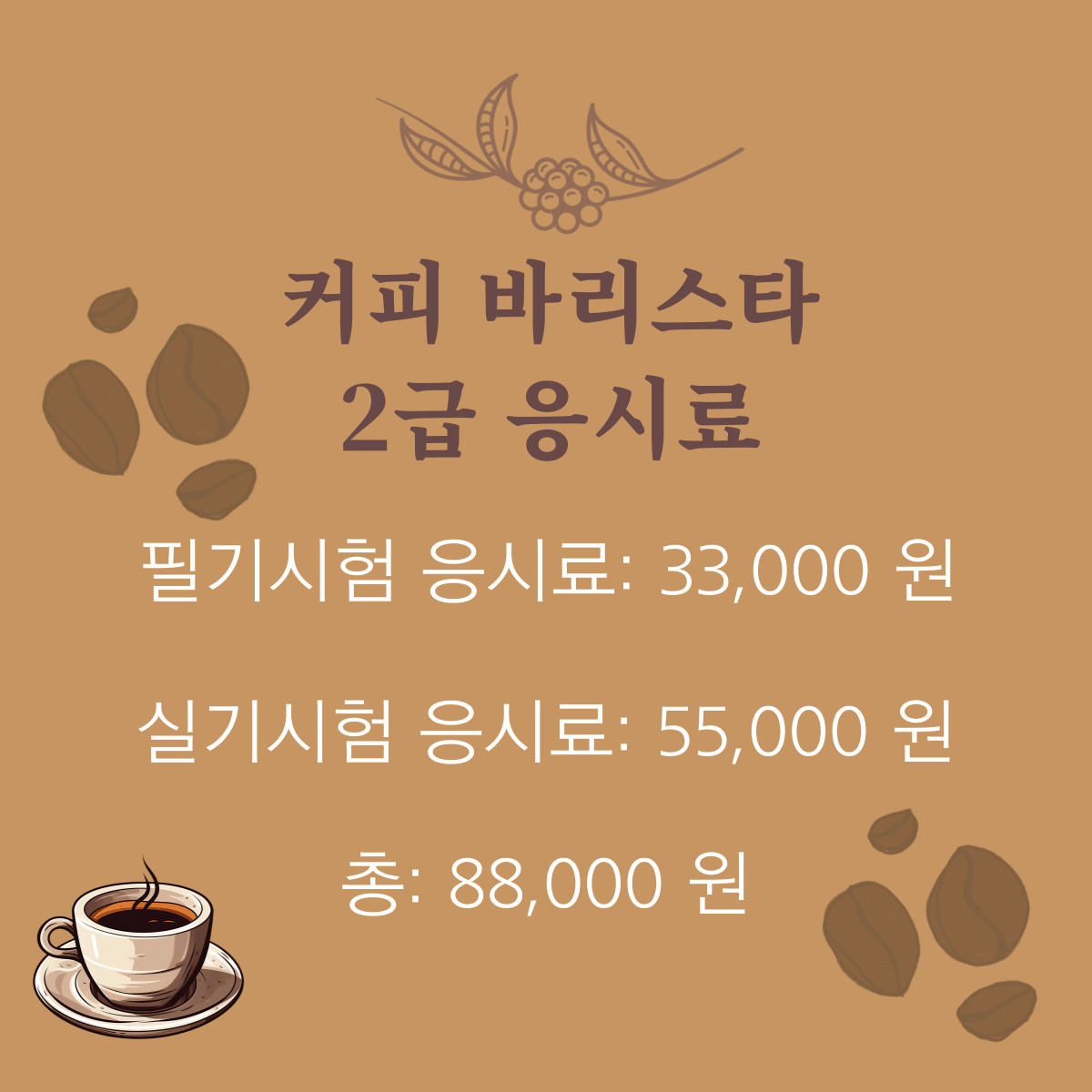 바리스타 2급 응시료는 필기시험은 4만원, 실기시험은 6만원원으로 총 10만원이 필요합니다.